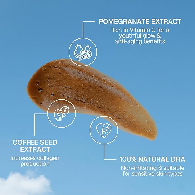 - 𝗡𝗼𝘂𝗿𝗶𝘀𝗵𝗶𝗻𝗴 𝘀𝗸𝗶𝗻𝗰𝗮𝗿𝗲 𝗯𝗲𝗻𝗲𝗳𝗶𝘁𝘀: Our tanning mousse is infused with natural DHA and enriched with skin-loving ingredients, including chamomile extract, coffee seed extract, and pomegranate extract. This delivers a flawless tan and also nourishes and conditions your skin.