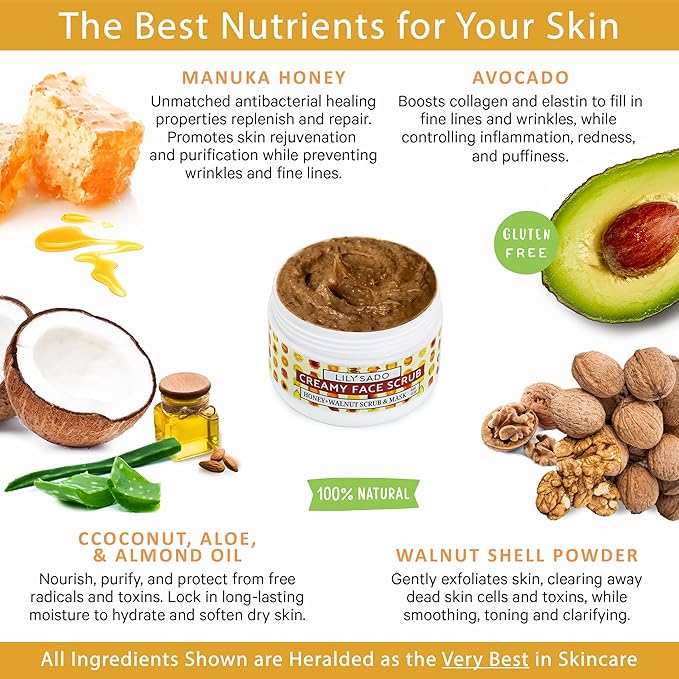 - π― MANUKA HONEY, WALNUT & 5 MOISTURIZING OILS - This spa-quality, exfoliating scrub combines the antioxidant powers of MANUKA HONEY, COCONUT & AVOCADO with nourishing and hydrating oils from RAPESEED, SUNFLOWER, ORANGE, LEMON & ALMOND. Natural WALNUT SHELLS gently buff away dead skin cells, leaving your skin smooth, radiant & bouncy-soft. VITAMINS C, B5 + E protect skin from daily stressors, while boosting collagen to plump skin, fill in fine lines & wrinkles, and enhance texture.