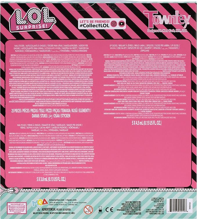 LOL Surprise Townley Girl 11 Pcs Sparkly Cosmetic Makeup Set for Kids Includes 5 Lip Gloss, 5 Nail Polish & Nail Stickers for Girls Tweens, Ages 3+ Perfect for Parties, Sleepovers and Makeovers