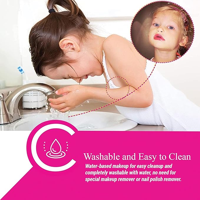 - Washable & Easy to clean: Each color shades goes on lightly for that pretty girl’s made-up look without looking too grown up. Water based makeup for easy to clean and completely washable makeup with water, there is no need for special makeup or nail polish remover. Care for children's skin.
