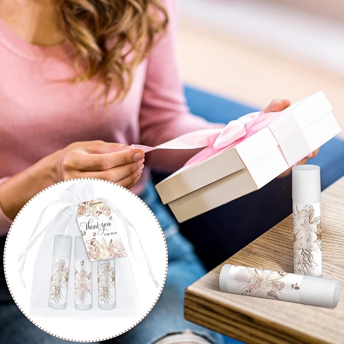 - Boho Baby Shower Favors: you will receive 50 lip balms, comes with 50 pieces of white organza bags, 50 pieces of thank you tags, as well as 1 twine of about 32.81 ft/ 10 meters, catering to your various needs