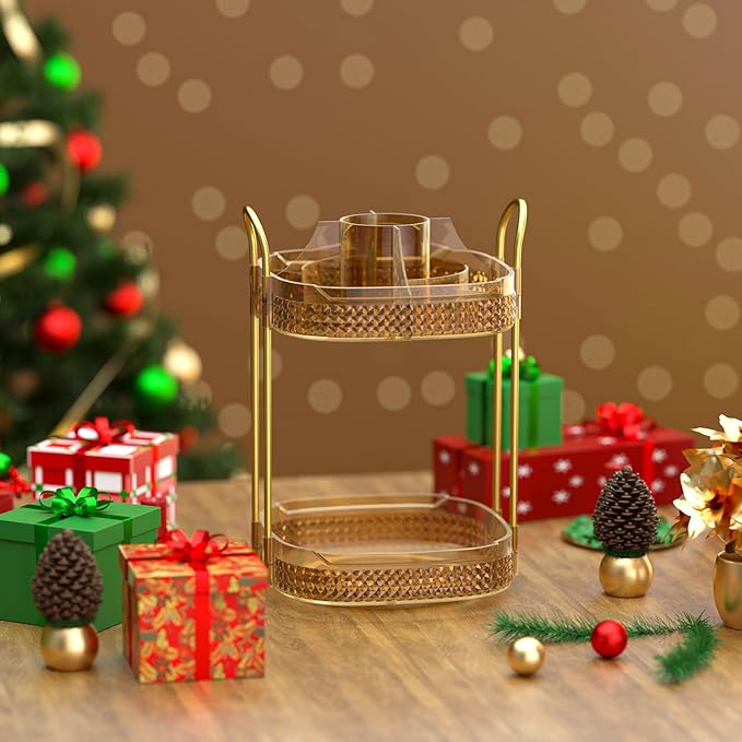 Awenia Rotating Makeup Organizer 360, Stackable Adjustable Large Capacity Cosmetic Storage Unit,Dresser Bathroom Kitchen Countertop Organizer with Metal Handle, Plus Size (Honorable Gold, 2 Tier)