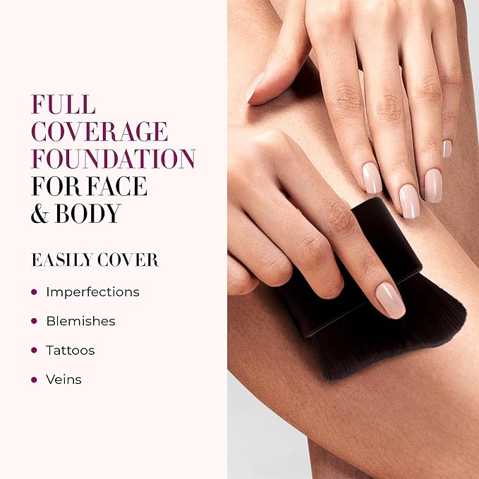 - Long-Lasting Foundation: This full coverage foundation is resistant to water and sweat. It blends seamlessly with the skin to minimize fine lines and texture for an airbrushed appearance that’s ideal for full body coverage and concealing tattoos and veins.