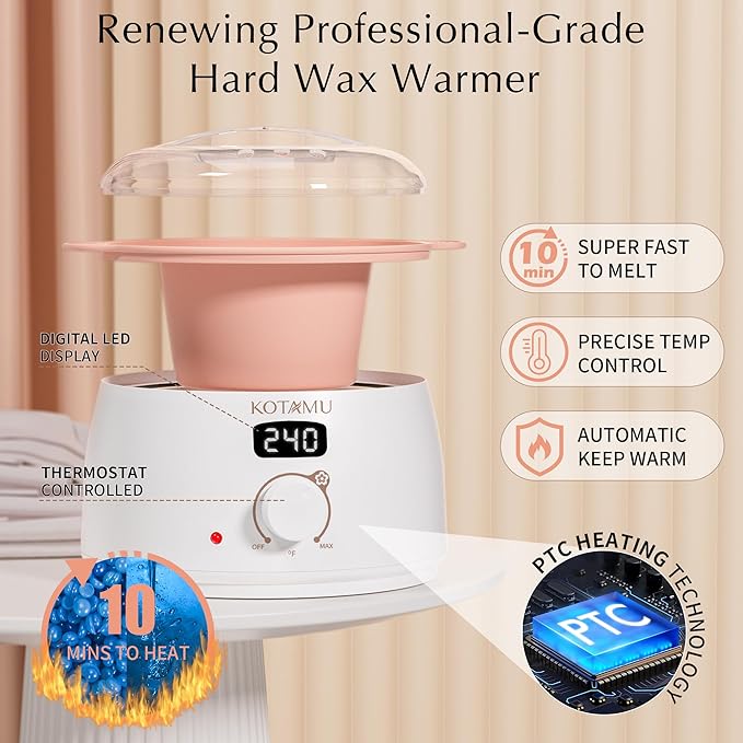 - Fast Heat Up & Precise Temp Control: Wave goodbye to wasted time! Our KOTAMU hard wax kit for hair removal introduces a digital wax machine that melts waxing beads in just 10-15 minutes. Ideal for busy lifestyles, this body wax kit keeps a steady temperature for a quick, safe, and smooth waxing session. Skip the salon queues and enjoy the speed and convenience of professional at-home hair removal!